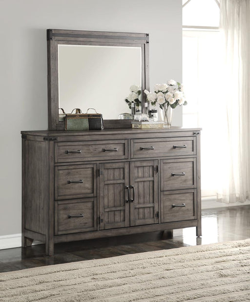 This dresser mirror is framed by gray finished wood, offering a straightforward solution to your room's needs.