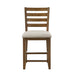 The traditional styling of the Tigard Collection lends timeless appeal to the look of your casual dining space. With subtle hints nodding to the Arts and Crafts design movement, the ladder-back counter height chair features classic lines that solidify the versatile aesthetic of the collection. Covering the padded seats of the chair is a neutral tone fabric upholstery, complementing the traditional cherry finish of the chair’s wood veneer. 20 x 22 x 41H