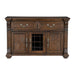The grand scale of the Bergen Collection invokes a timeless aesthetic for your home’s traditional dining room. The dark oak finish highlights the distinct oak veneer of the collection, while also lending contrast to the decorative accenting of the curio’s design. Faux keyhole hardware fronts the doors of the server, while traditional bale hardware fronts the drawers. The glass door of the server allows for enclosed display of your wine collection while traditional accenting abounds throughout the piece with classic routed pilasters, moldings, and decorative pediments gracing the design. 60 x 19 x 39H