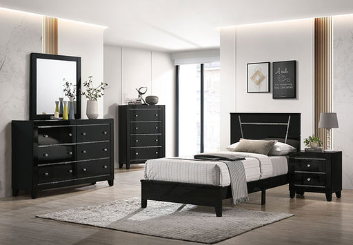 MAGDEBURG Cal.King Bed, Black, 88 1/4"L X 74 7/8"W X 42 3/8"H, 102.5lbs. For a minimalistic space, this ensemble sets the perfect tone. With a sleek, high gloss finish, each piece exudes a sense of confidence that's hard to ignore. The straight and sleek lines highlight the simple silhouettes, interrupted only by its hallmark feature--glitter-filled panel gaps in the headboard and the case goods that add just enough glam to this stunner of a set.