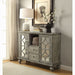 - The transitional Velinka Console Table features a weather gray finish with mirrored glass doors and a diamond trim inlay. The wood console table features 2 storage doors, 2 storage drawers and one shelf providing ample display and additional storage space. The modern style cabinet with gray tones, matching gray inlay and bun legs will add a stylish accent to every room in your home. Whichever room you choose to use the Velinka in its style will not only blend masterfully but is sure to be the conversation piece.